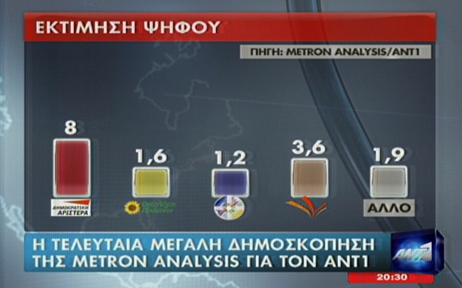 Συγκεκριμένα στην πρόθεση ψήφου η ΝΔ λαμβάνει 22,7%, ο ΣΥΡΙΖΑ 22% , το ΠΑΣΟΚ 11,2%. οι Ανεξάρτητοι Έλληνες 5,7%, το ΚΚΕ 4,4%, η ΔΗΜΑΡ 6,7% , η Χρυσή Αυγή 3,9% και η Δημιουργία Ξανά-Δράση 3%. Εκτός μένεο ο ΛΑΟΣ και οι Οικολόγοι.