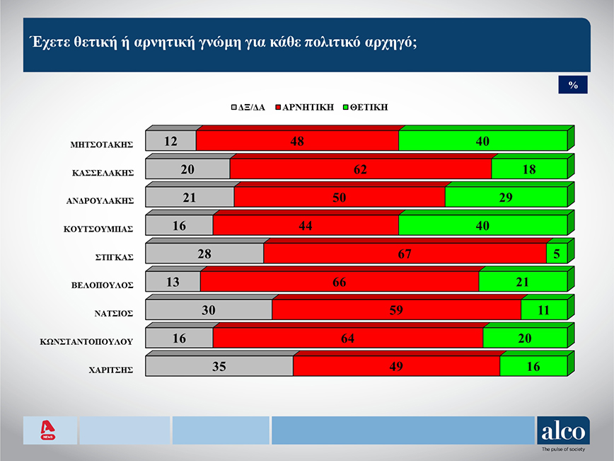 Το δεύτερο μέρος της δημοσκόπησης της Alco παρουσίασε ο Alpha. Σ’ αυτήν μετριέται τόσο η δημοφιλία των πολιτικών αρχηγών όσο και οι θετικές γνώμες για τους υπουργούς της κυβέρνησης.