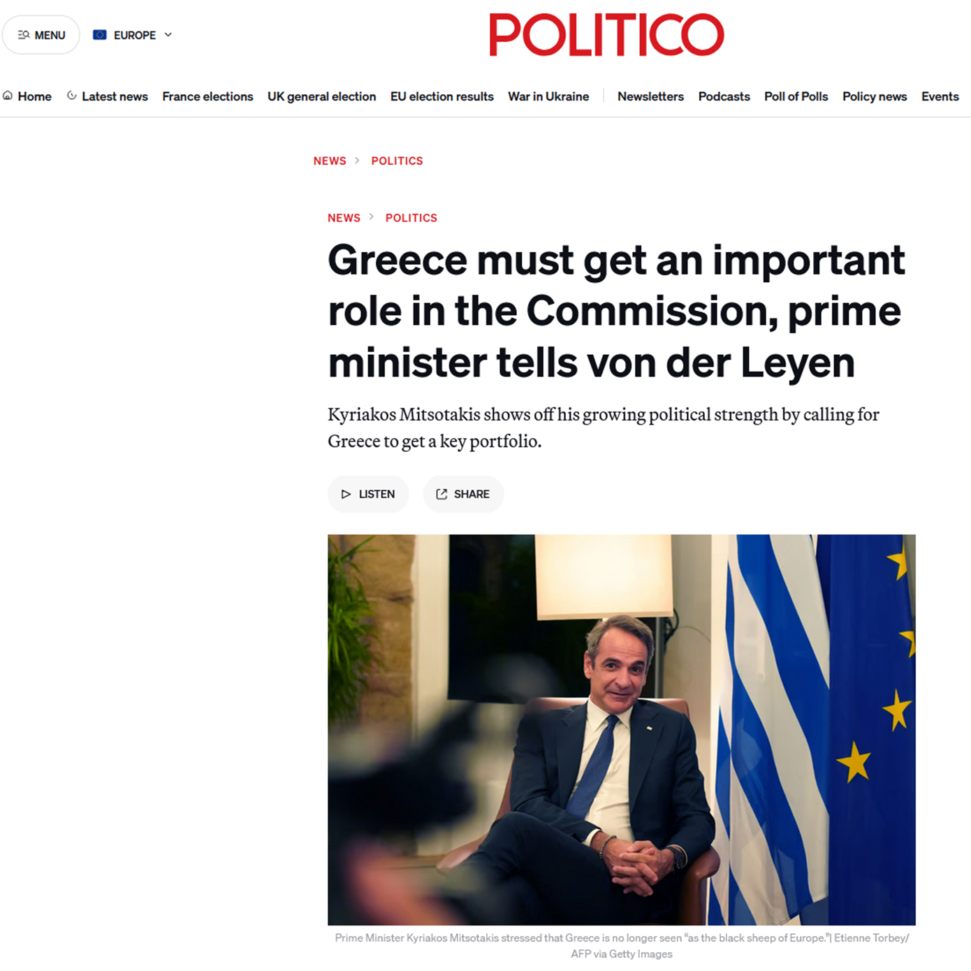 Ο έλληνας πρωθυπουργός είναι ανένδοτος στο να πάρει η χώρα του μια πολύ σημαντική θέση, όταν η Ούρσουλα φον ντερ Λάιεν συγκροτήσει την κορυφαία ομάδα της. Ο Κυριάκος Μητσοτάκης μπορεί να πάρει αυτό που θέλει, αφού έπαιξε καθοριστικό ρόλο στο να βοηθήσει την πρόεδρο της Ευρωπαϊκής Επιτροπής να εξασφαλίσει μια δεύτερη θητεία, σημειώνει το Politico.
