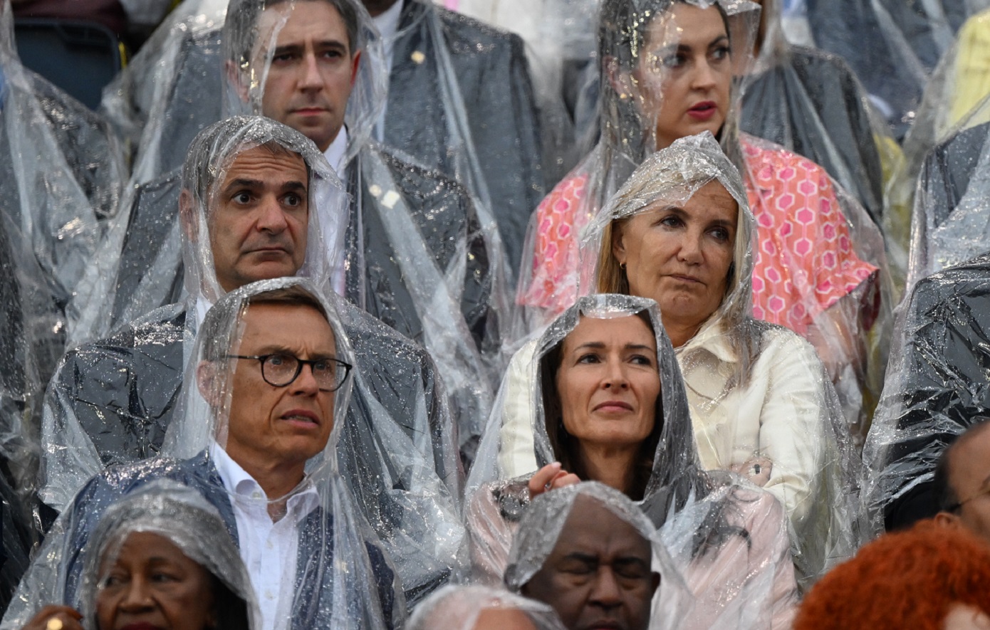 Η τελετή έναρξης των Ολυμπιακών Αγώνων του Παρισιού πραγματοποιήθηκε υπό έντονη βροχόπτωση, με τον πρωθυπουργό και τη σύζυγό του να παρακολουθούν από την εξέδρα των επισήμων και φορώντας αδιάβροχο.