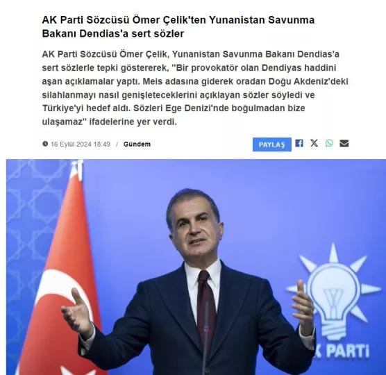 Όπως μεταδίδει ο ανταποκριτής του ΣΚΑΪ στην Κωνσταντινούπολη, Μανώλης Κωστίδης, ο εκπρόσωπος του Κόμματος Δικαιοσύνης και Ανάπτυξης αναφέρει τα εξής: «Η πόρτα του διαλόγου άνοιξε κατά τη συνάντηση του προέδρου μας με τον Μητσοτάκη. Την ώρα που επιδιώκεται αυτή η προσέγγιση, ακραία στοιχεία στην Ελλάδα κάνουν ό,τι μπορούν για να σαμποτάρουν αυτόν τον διάλογο. Ο προβοκάτορας Δένδιας έκανε δηλώσεις που ξεπέρασαν τα όρια. Πήγε στο Καστελόριζο και έκανε δηλώσεις εξηγώντας πώς θα επεκτείνουν τον εξοπλισμό στην Ανατολική Μεσόγειο και στοχοποίησε την Τουρκία. Τα λόγια του δεν μπορούν να μας φτάσουν χωρίς να… πνιγούν στο Αιγαίο. Αυτή η δήλωση του Δένδια είναι μια δήλωση που δεν θέλει τον διάλογο. Το λόμπι του χάους θέλει να υπονομεύσει τις προσπάθειες για διάλογο. Αυτό είναι ακριβώς το αντίθετο από τη δήλωση Μητσοτάκη: «να συνεχίσουμε τον διάλογο».