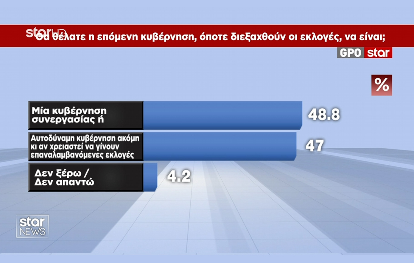 Η τάση για μια κυβέρνηση συνεργασίας καταγράφει οριακή υπεροχή στις προτιμήσεις των ερωτηθέντων. Συγκεκριμένα: