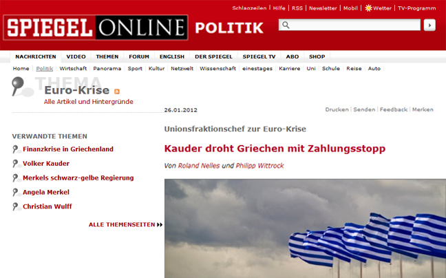 «Οι Έλληνες να κάνουν δημοψήφισμα για να αποφασίσουν αν θα μπορούσαν να δεχθούν μία προσωρινή εποπτεία από έναν επίτροπο για μία λειτουργική δημοσιονομική διαχείριση, ή την έξοδό τους από την ευρωζώνη» δήλωσε στο Spiegel Online ο Volke Kauder, επικεφαλής του CDU, κόμματος της Άγκελα Μέρκελ, υπογραμμίζοντας ότι «δε μπορούμε να δίνουμε συνεχώς λεφτά σε μία χώρα που αποτελεί ένα τεράστιο πρόβλημα για την Ευρώπη, αφού η πρόοδος που σημειώνεται είναι ελάχιστη».