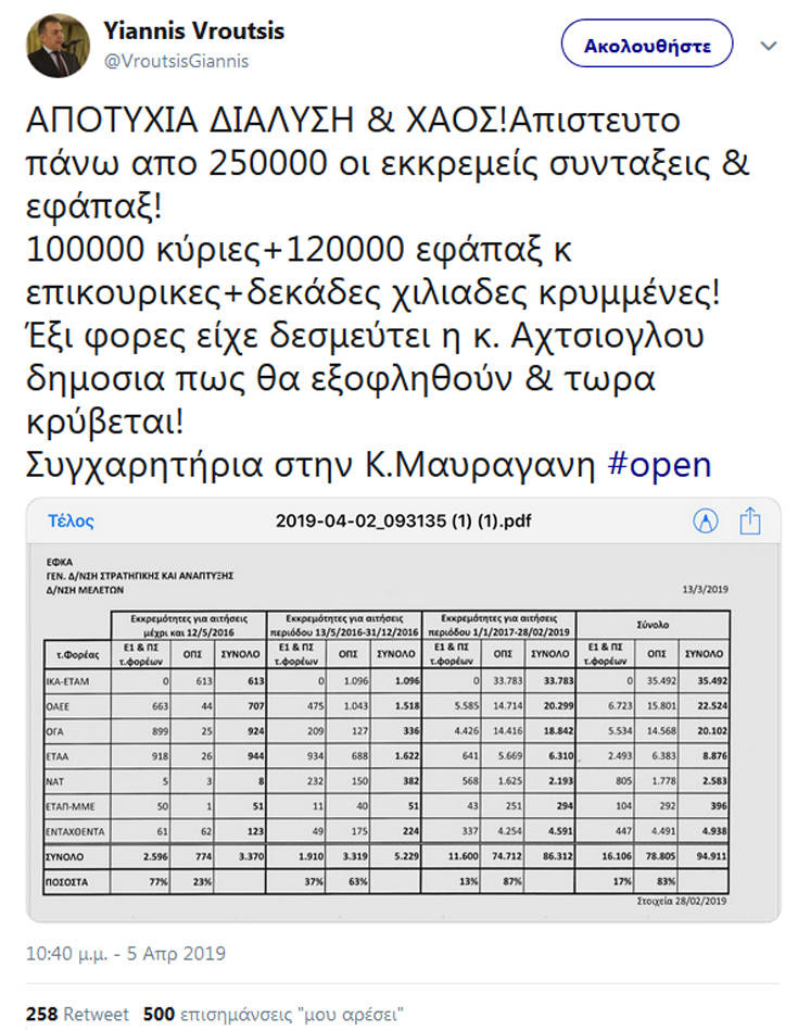 Ο πρώην υπουργός Εργασίας με ανάρτησή του στο twitter κάνει λόγο για «Αποτυχία, διάλυση και χάος» ενώ υποστηρίζει ότι ο αριθμός των συντάξεων και των εφάπαξ που εκκρεμούν φτάνει τις 250.000 επικαλούμενος σχετικό έγγραφο που διέρρευσε απ’ τον ΕΦΚΑ και δημοσιεύτηκε στον τύπο.