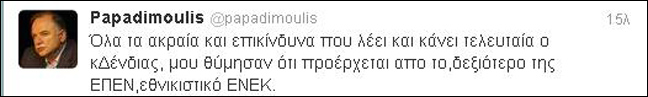 Και γράφει συγκεκριμένα: «Όλα τα ακραία και επικίνδυνα που λέει και κάνει τελευταία ο κ. Δένδιας, μου θύμισαν ότι προέρχεται από το δεξιότερο της ΕΠΕΝ, εθνικιστικό ΕΝΕΚ».