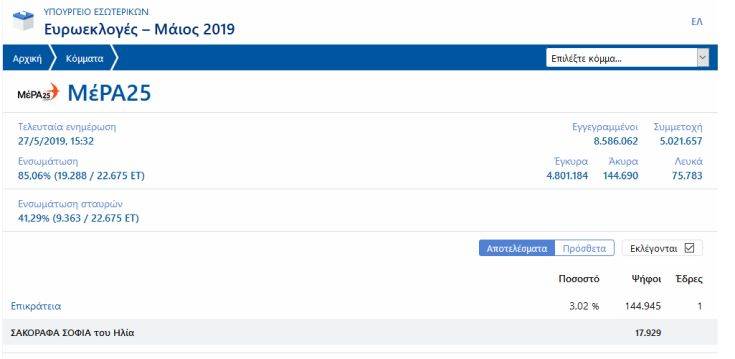 Με ποσοστό μέχρι στιγμής, οριακό, 3,02% από 3,03% που είχε λίγη ώρα νωρίτερα και στο 85,06% της ενσωμάτωσης εκλέγει έναν ευρωβουλευτή.