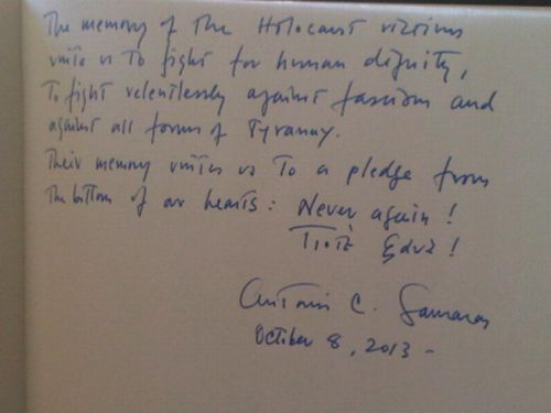 «Η μνήμη των θυμάτων του Ολοκαυτώματος μάς προσκαλεί να παλέψουμε για την ανθρώπινη αξιοπρέπεια. Να παλέψουμε ενάντια στο φασισμό και σε κάθε μορφή τυραννίας. Η μνήμη τους μάς προσκαλεί να δεσμευτούμε από τα βάθη της ψυχής μας. Ποτέ ξανά!».