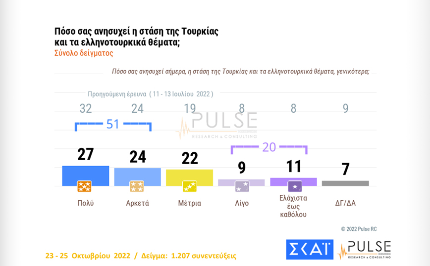 Για το πόσο σας ανησυχεί η στάση της Τουρκίας στα ελληνοτουρκικά, το 51% απάντησε πολύ ή αρκετά, το 22% μέτρια, το 20% λίγο ή ελάχιστα έως καθόλου και 7% ΔΓ/ΔΑ.
