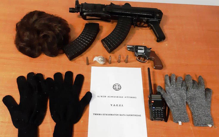 Βρέθηκαν και κατασχέθηκαν, πολεμικό Καλάσνικοφ, περίστροφο, φυσίγγια, κινητά τηλέφωνα, μικροποσότητα κάνναβης, είδη ρουχισμού και περούκα.
