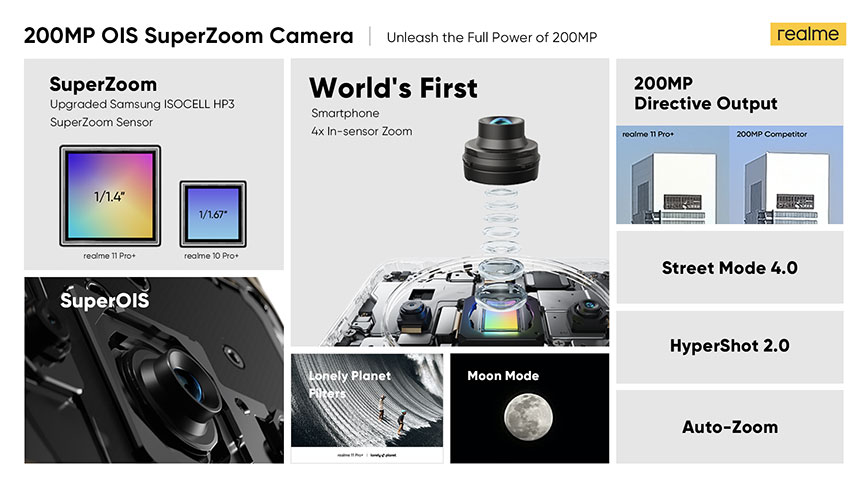 ·Ο αναβαθμισμένος αισθητήρας SuperZoom ISOCELL HP3 της Samsung: Tο realme 11 Pro+ 5G είναι εξοπλισμένο με τη ναυαρχίδα της φωτογραφικής μηχανής της realme, την κάμερα OIS SuperZoom 200MP. Το σύστημα κάμερας 200MP στο realme 11 Pro+ 5G βασίζεται στο αναβαθμισμένο σύστημα κάμερας Samsung ISOCELL HP3 SuperZoom με μέγεθος αισθητήρα 1/1,4 ίντσες, μέγεθος pixel 2,24μm και διάφραγμα f/1,69. Όλα έρχονται διαμορφωμένα σε επίπεδο ναυαρχίδας στο ίδιο εύρος τιμών – δημιουργώντας ένα τεράστιο άλμα σε σύγκριση με ανταγωνιστές που εξακολουθούν να χρησιμοποιούν τον αισθητήρα IMX766.