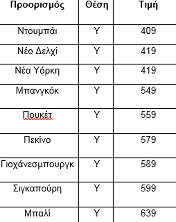Ακολουθούν οι προσφορές για τους παρακάτω ενδεικτικούς προορισμούς:
