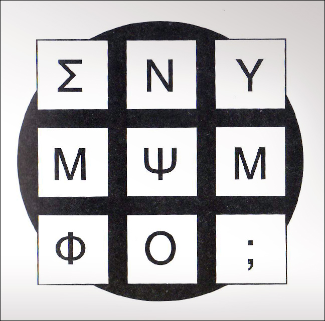 Θεωρούμε την αντιστοιχία Ω=1, Ψ=2 κλπ. Καθένα από τα γράμματα που βρίσκεται στο κέντρο κάθε γραμμής ισούται με το άθροισμα του πρώτου με το τρίτο γράμμα κάθε γραμμής.