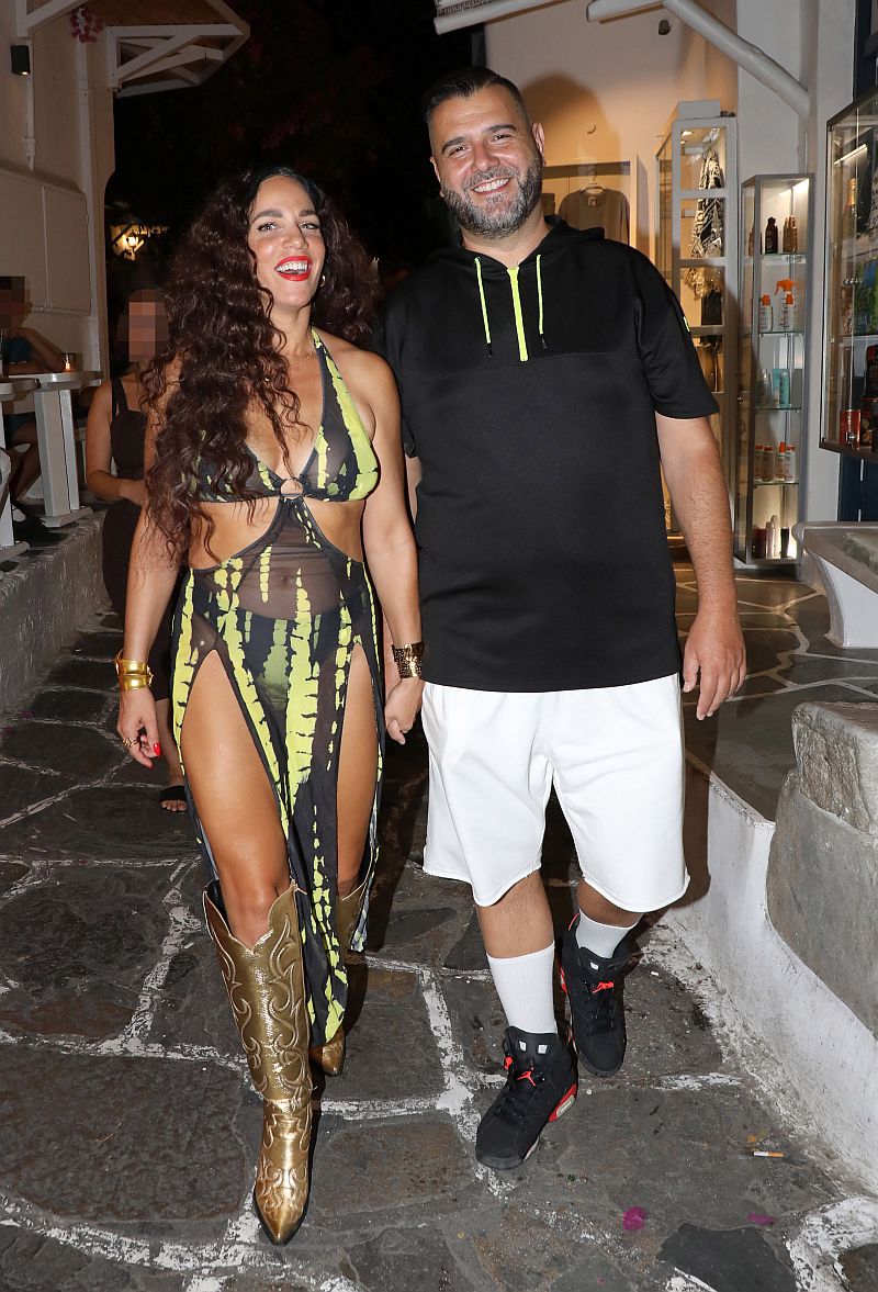Η Κατερίνα Στικούδη επέλεξε για τη βραδινή της βόλτα ένα φόρεμα με πάρα πολύ έντονα cut outs και διαφάνεια σε κιτρινόμαυρο χρώμα, με ασορτί μπικίνι από μέσα και χρυσές μπότες τύπου cowboy. Ολοκλήρωσε την εμφάνισή της με χρυσά chunky κοσμήματα.