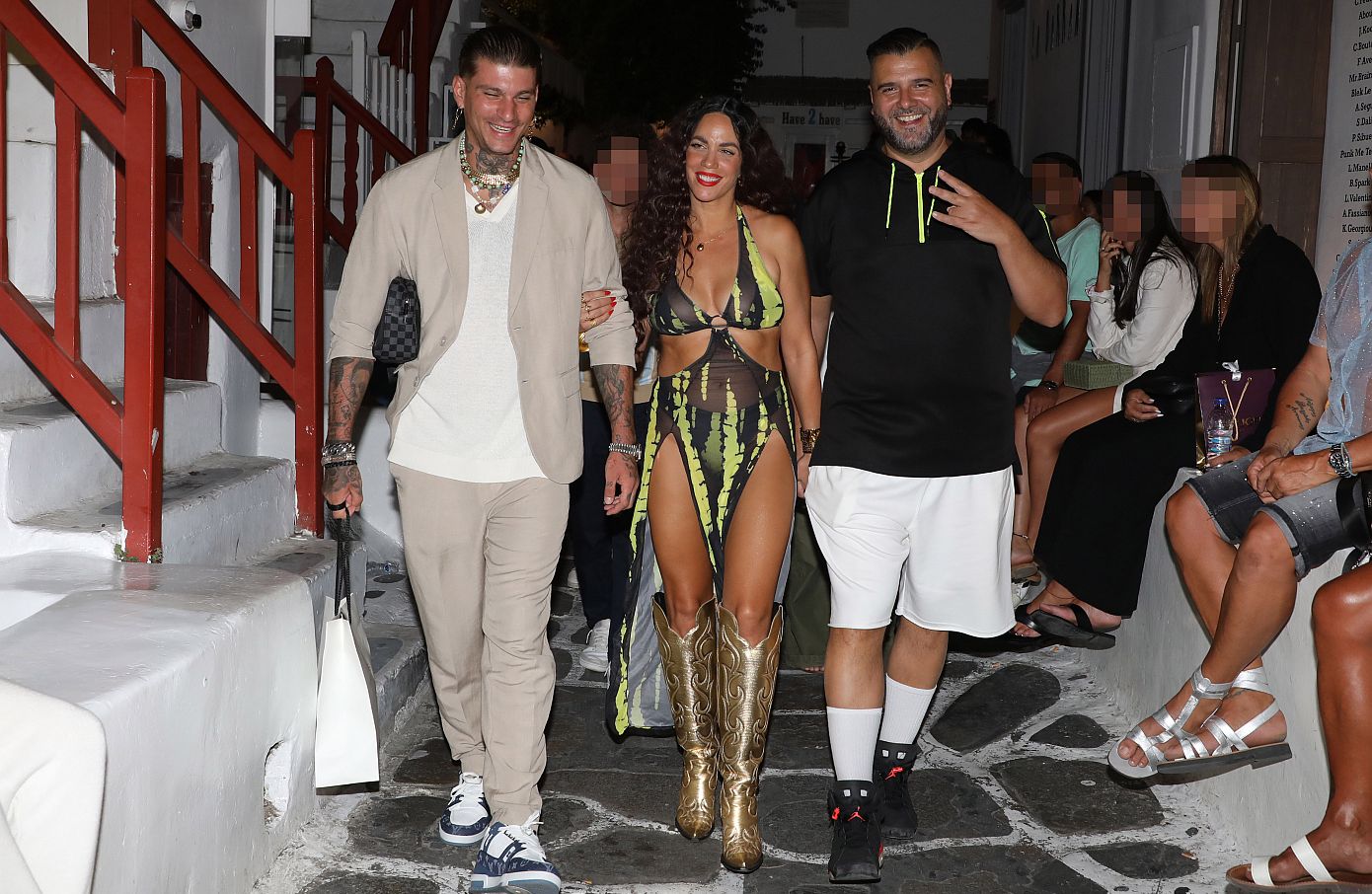 H Kατερίνα Στικούδη βρέθηκε στη Μύκονο μαζί με το σύζυγό της, Bαγγέλη Σερίφη, και τον φίλο τους, Στέφανο Μιλάτο, και ο φωτογραφικός φακός τους απαθανάτισε να περπατούν στα Ματογιάννια.