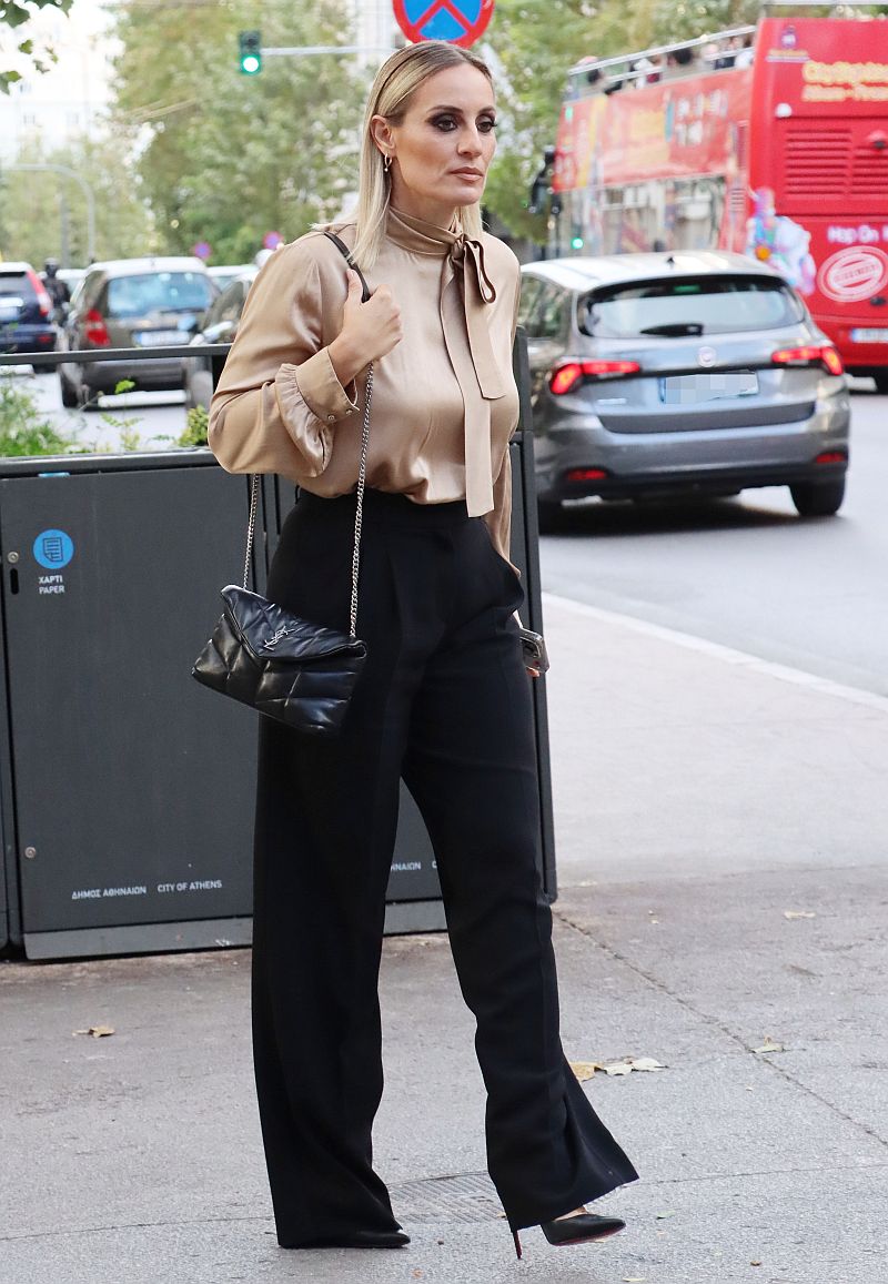 Η Ελεονώρα Μελέτη επέλεξε ένα bow shirt στο χρώμα της άμμου, μία μαύρη φαρδιά παντελόνα, μαύρες μυτερές γόβες και ολοκλήρωσε το look της με μία chain bag που είχε την υπογραφή Saint Laurent. Η ευρωβουλεύτρια είχε χτενίσει τα καρέ μαλλιά της σε ένα sleek look προς τα πίσω και το μακιγιάζ της περιελάμβανε έντονα smokey eyes και κραγιόν σε γήινους τόνους. Το μοναδικό κόσμημα που φόρεσε ήταν ένα ζευγάρι μικρούς κρίκους το οποίο ταίριαζε απόλυτα με το υπόλοιπο στιλ της.