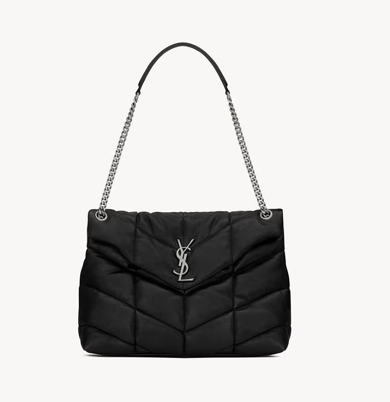 H τσάντα της Ελεονώρας Μελέτη είναι το σχέδιο PUFFER MEDIUM in Nappa leather του οίκου Saint Laurent και στο μεσαίο μέγεθος κοστίζει 2.900 € στο επίσημο site του οίκου.