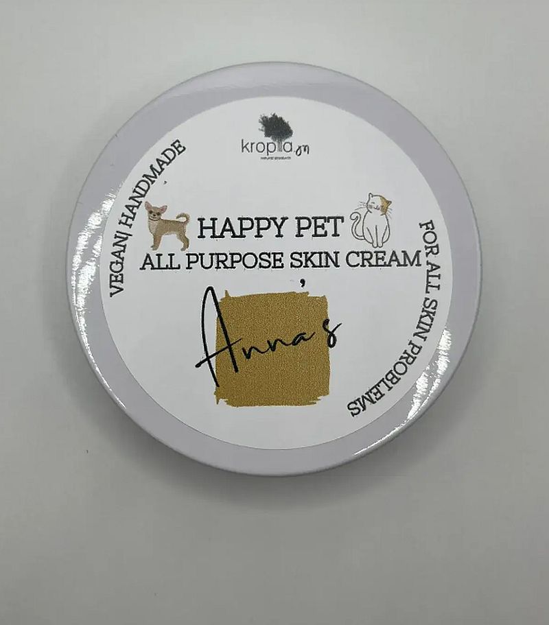 Η κρέμα “happy pet, all-purpose skin cream” by Anna’s είναι ένα φυσικό προϊόν το οποίο ενυδατώνει, καταπραΰνει και προστατεύει τα πέλματα και το δέρμα των μικρών μας φίλων. Είναι κατάλληλη για δερματικές παθήσεις, επούλωση τραυματισμών, εγκαύματα και κνησμό. Xρησιμοποιoύμε την κρέμα μία με δύο φορές την ημέρα τοπικά.