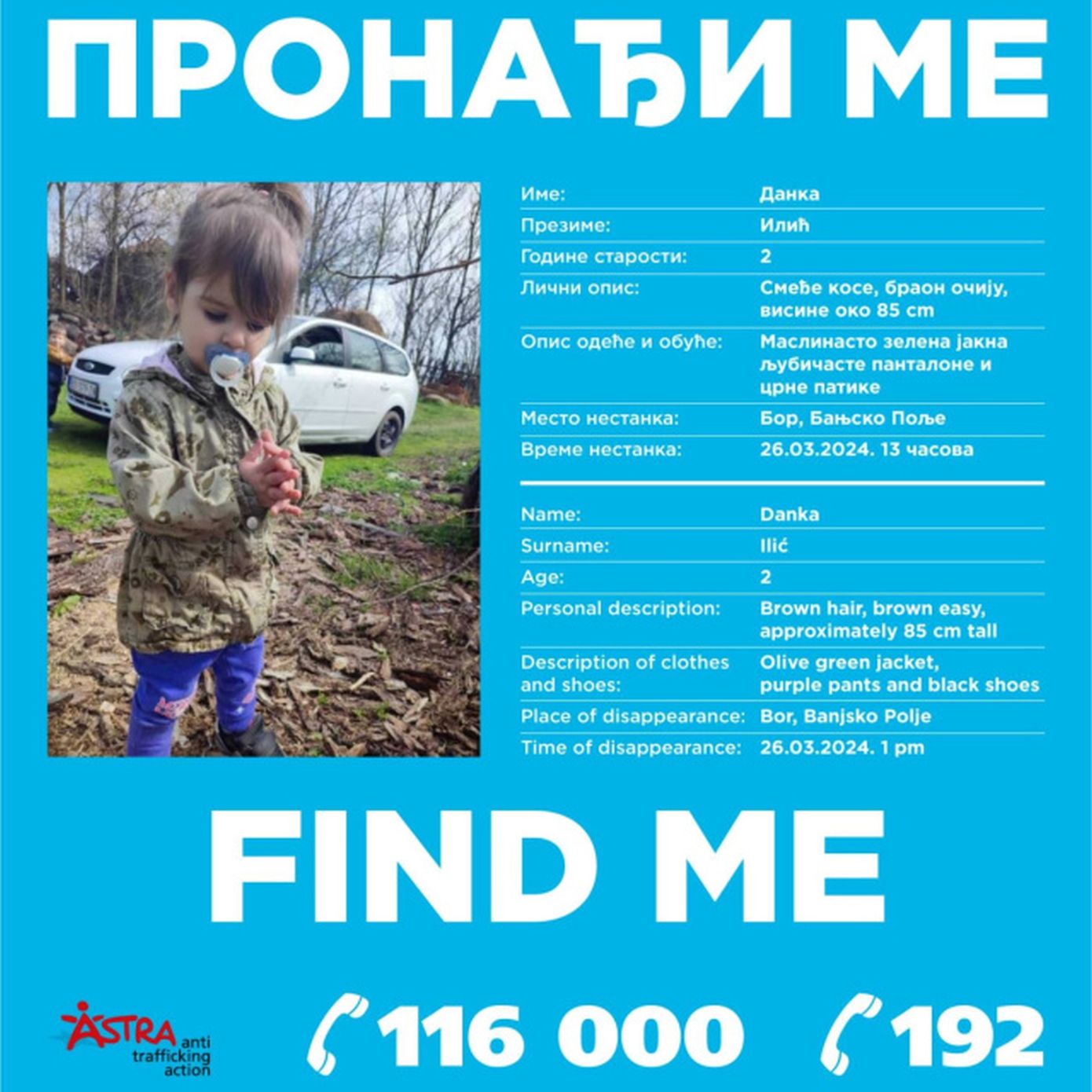 Η εξαφάνιση της μικρής είχε κινητοποιήσει τις σερβικές αρχές αλλά και την Ιντερπόλ, μιας και υπήρχαν υποψίες ότι απήχθη από υπηκόους γειτονικού κράτους. Στη Σερβία για πρώτη φορά λειτούργησε το σύστημα άμεσης αναφοράς για εξαφάνιση ανηλίκου (Amber Alert) και υπήρξε μεγάλη ανταπόκριση του κόσμου στις προσπάθειες των Αρχών για τον εντοπισμό της δίχρονης Ντάνκα Ίλιτς.