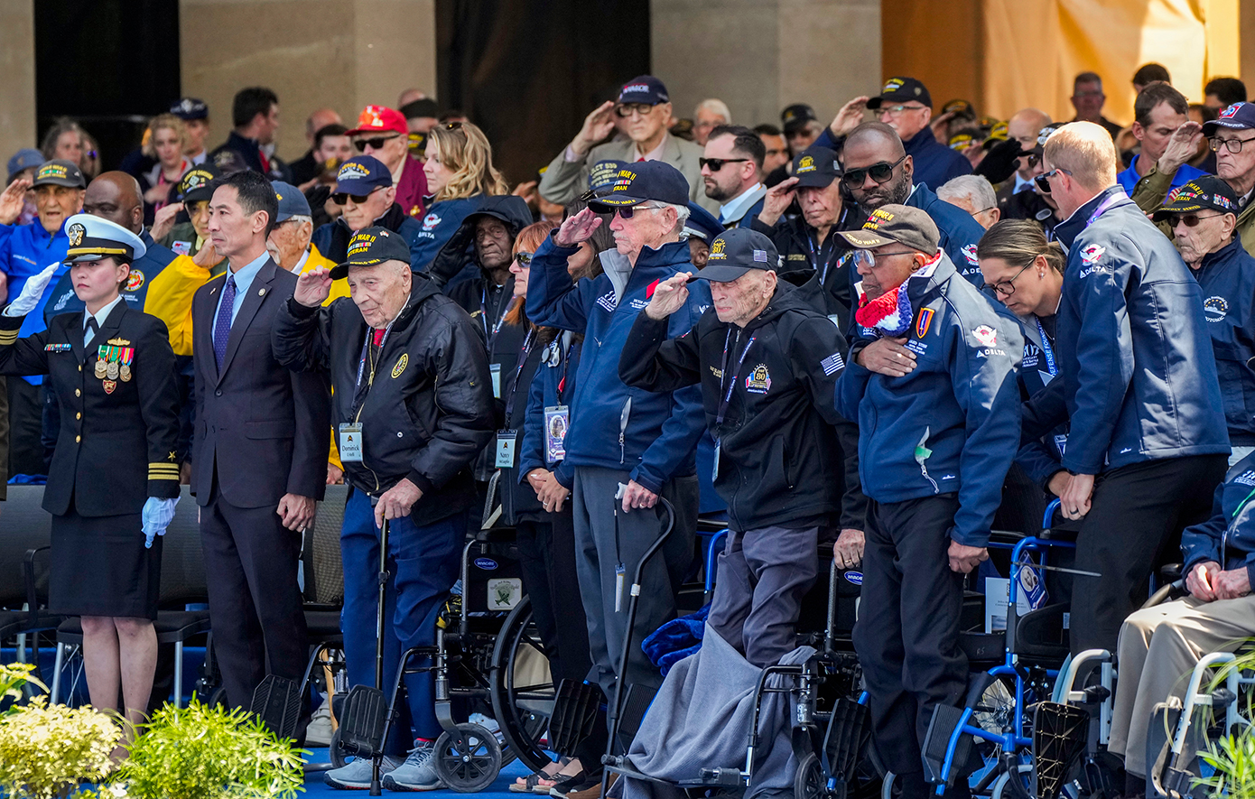 Στην αμερικανική τελετή στο κοιμητήριο του Κολβίλ-σιρ-Μερ, ο Μακρόν απένειμε το μετάλλιο της Λεγεώνας της Τιμής στους αμερικανούς βετεράνους. Πολλοί ήταν σε αναπηρικά καροτσάκια, φορώντας καπελάκια με την επιγραφή “WWII veteran.” (Βετεράνος του Β’ Παγκοσμίου Πολέμου”)