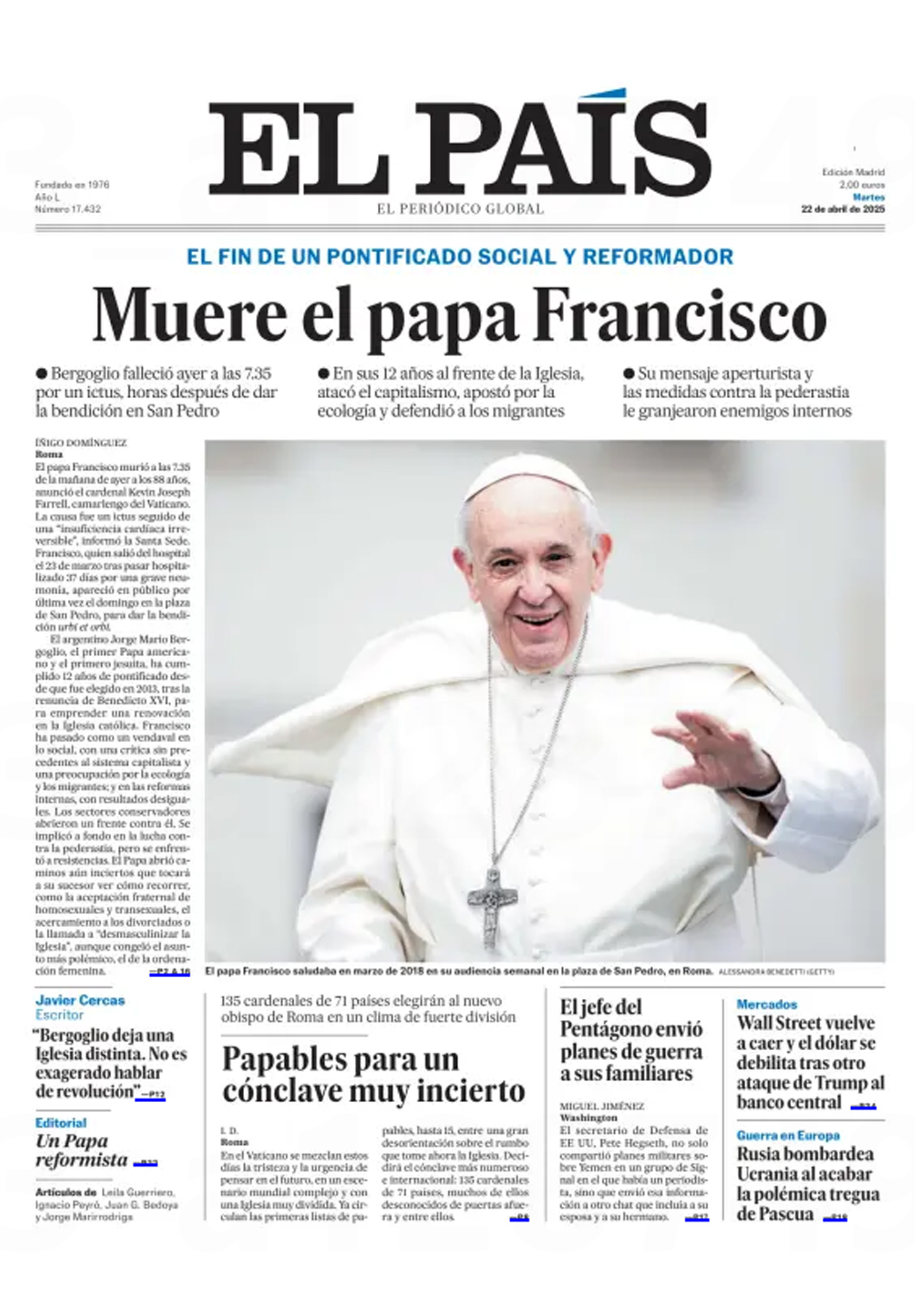 Στην Ισπανία, η μεγαλύτερη εφημερίδα της χώρας, η El Pais, γράφει για «Το τέλος της περιόδου ενός κοινωνικού και μεταρρυθμιστή ποντίφικα».