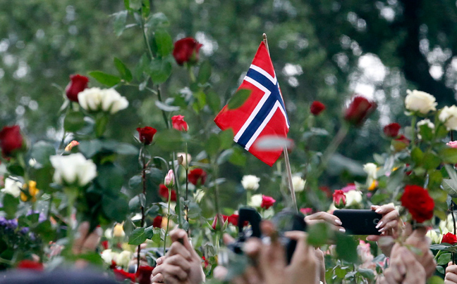 Κρατώντας λευκά ή κόκκινα τριαντάφυλλα, τουλάχιστον 100.000 άνθρωποι συγκεντρώθηκαν στο Όσλο χθες για να εκφράσουν τη θλίψη τους για τα θύματα των επιθέσεων της Παρασκευής, από τις οποίες έχασαν τη ζωή τους 76 άνθρωποι.