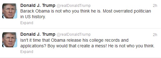 «Δεν είναι πια καιρός ο Ομπάμα να δημοσιεύσει την αναλυτική βαθμολογία του από το κολλέγιο; Αυτό και αν θα δημιουργούσε ένα χάος!», έγραψε χαρακτηριστικά ο μεγιστάνας στον προσωπικό του λογαριασμό στο Twitter.