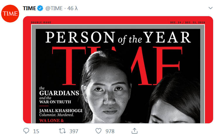 Όπως αναφέρει το Αθηναϊκό Πρακτορείο, εκτός από τον Τζαμάλ Κασόγκι, το εβδομαδιαίο περιοδικό τίμησε ως προσωπικότητες της χρονιάς τη Φιλιππινέζα δημοσιογράφο Μαρία Ρέσα, τους δύο Βιρμανούς ρεπόρτερ του πρακτορείου Ρόιτερ Ουά Λόουν και Κέι Σου Όου, που βρίσκονται αυτή τη στιγμή στη φυλακή, καθώς και τη σύνταξη της αμερικανικής τοπικής εφημερίδας Capital Gazette, πέντε μέλη της οποίας έχασαν τη ζωή τους στη διάρκεια επίθεσης που πραγματοποιήθηκε στις 28 Ιουνίου στην Ανάπολη της Πολιτείας του Μέριλαντ.