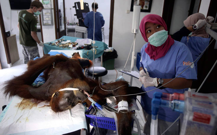 Κτηνίατροι και εθελοντές του προγράμματος SOCP χειρουργούν την «Ελπίδα», μία ουραγκοτάγκο, σε περιοχή της Βόρειας Σουμάτρας στην Ινδονησία.