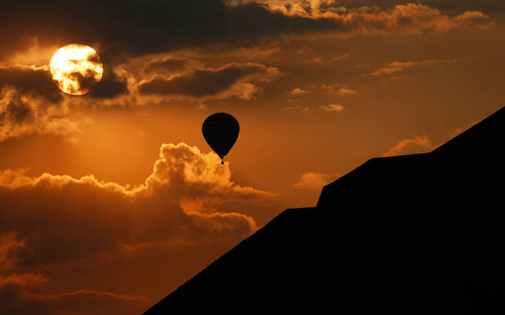 Ένα αερόστατο πετάει κοντά στην Πυραμίδα του Ήλιου στο Teotihuacan, στο Μεξικό, απολαμβάνοντας τη θέα.