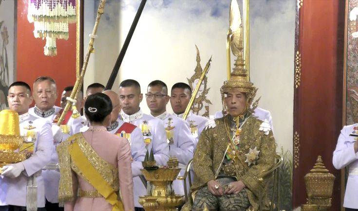 Σήμερα στο Μεγάλο Παλάτι της Μπανγκόκ, λίγα λεπτά αφού ο σύζυγός της φόρεσε στο κεφάλι του τη «Μεγάλη Κορώνα της Νίκης», τον προσκύνησε σε ένδειξη σεβασμού. Ο βασιλιάς έριξε λίγες σταγόνες νερό στο μέτωπό της προτού της δώσει τα σύμβολα του νέου της ρόλου, αυτού της βασίλισσας. Στη συνέχεια έκατσε δίπλα του στην αίθουσα του θρόνου.