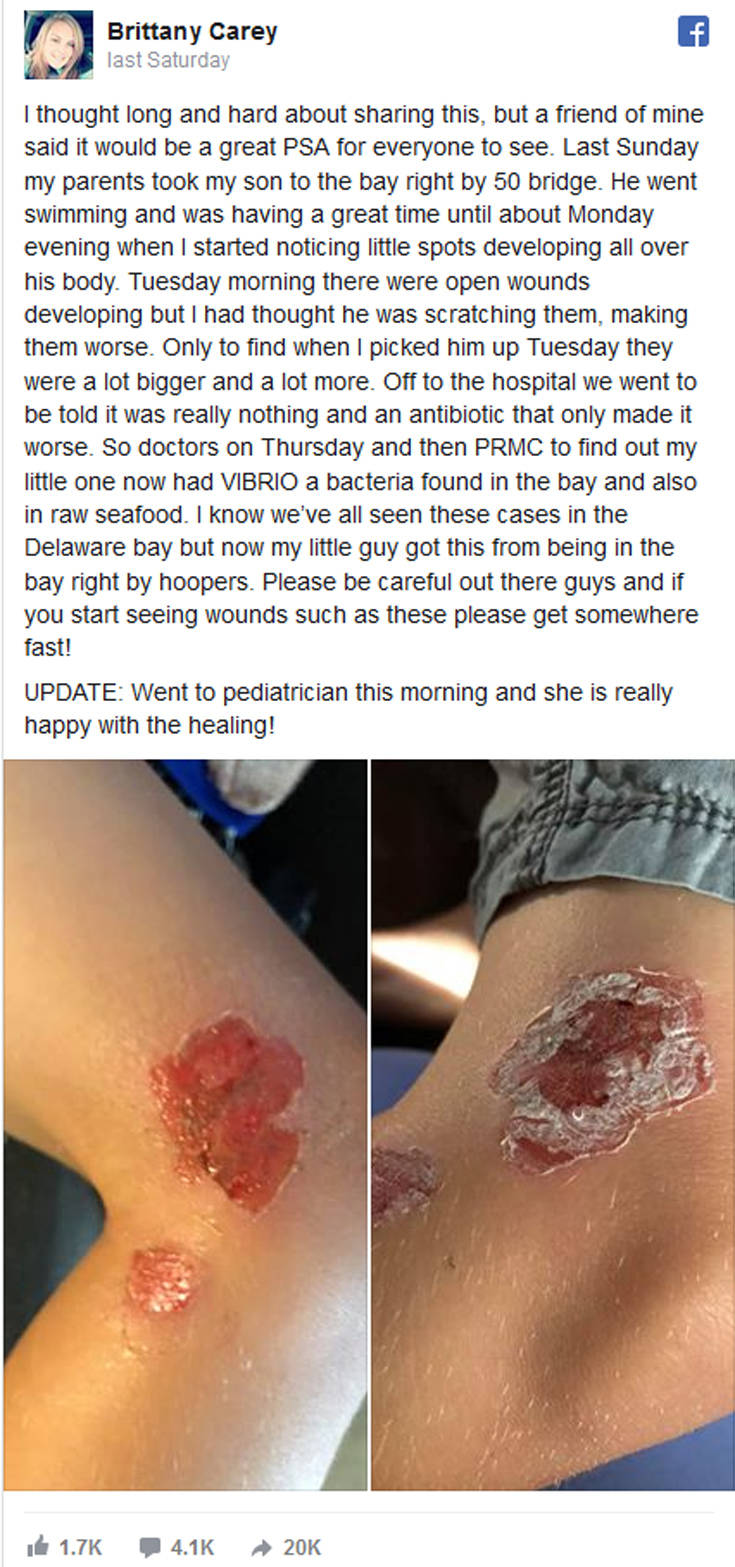 Όπως έγραψε η Brittany Carey στο Facebook, ο γιος της εμφάνισε αρχικά κόκκινα σημάδια στο σώμα, μετά τη βουτιά του στη ακτή του Ocean City. Όταν τα σημάδια εξελίχθηκαν σε ανοιχτές πληγές, η γυναίκα πήγε το αγόρι στο νοσοκομείο του Salisbury, όπου οι γιατροί διέγνωσαν μόλυνση από Vibrio, ένα είδος βακτηρίου που κάνει το δέρμα να σαπίζει, προκαλώντας νεκρωτική απονευρωσίτιδα.