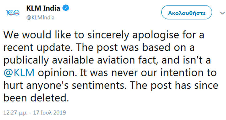 Εν τέλει πάλι μέσω Twitter ήρθε η συγγνώμη: «Θα θέλαμε να ζητήσουμε συγγνώμη για την ανάρτηση. Το ποστάρισμα βασίστηκε σε κοινά αποδεκτά στοιχεία πτήσεων και όχι στην άποψη της εταιρείας. Δεν ήταν στις προθέσεις μας να προσβάλουμε τα αισθήματα κανενός».