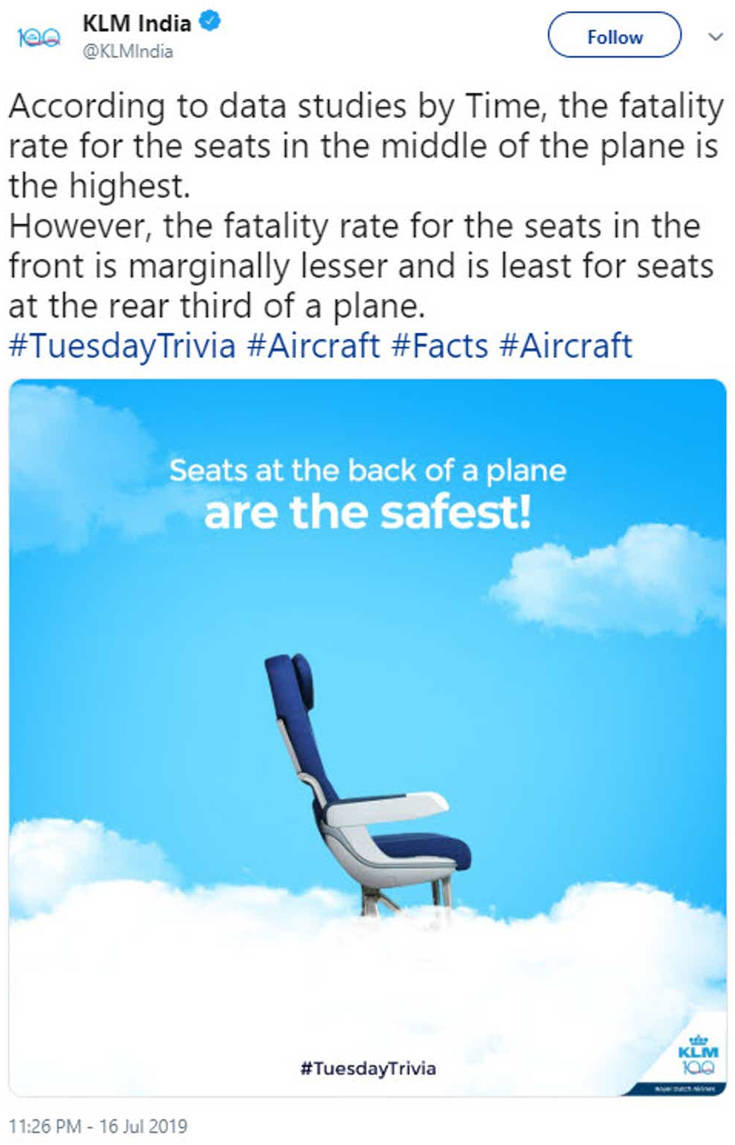 Μία ανάρτηση της ολλανδικής αεροπορικής εταιρείας KLM India στο Twitter που αποκάλυπτε ποιες είναι οι ασφαλέστερες θέσεις μέσα σε ένα αεροσκάφος και ποιες αυτές που έχουν τα μεγαλύτερα ποσοστά θνησιμότητας, προκάλεσε πλήθος αντιδράσεων.