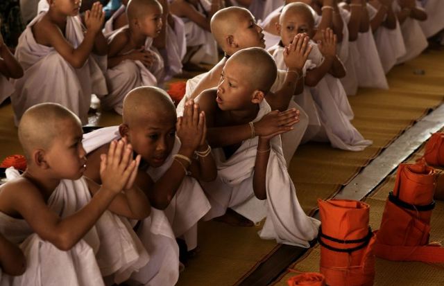 Ο Βουδισμός Τεραβάντα, που εξασκείται σε χώρες όπως είναι η Ταϊλάνδη και η Σρι Λάνκα, περιλαμβάνει ένα αυστηρά καθορισμένο τελετουργικό για τη χειροτόνηση των παιδιών. Ο φωτογράφος Vincezo Floramo φωτογράφησε τη διαδικασία αυτή για τα δύο παιδιά, κατά τη διάρκεια των εορτασμών Ta Pwe, οπότε και τουλάχιστον 40 μικροί Ταϊλανδοί ξυρίζουν τα μαλλιά τους στην πανσέληνο του Μαρτίου.
