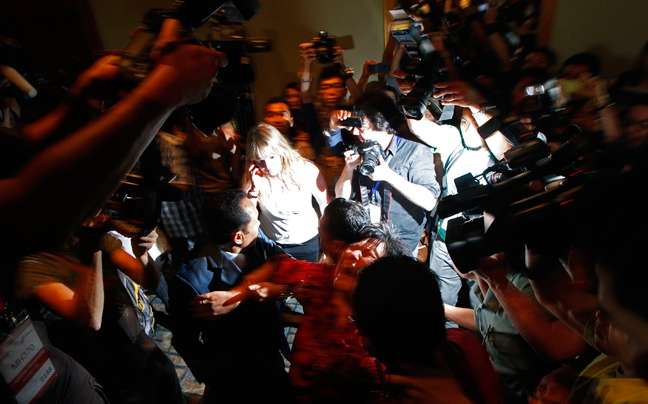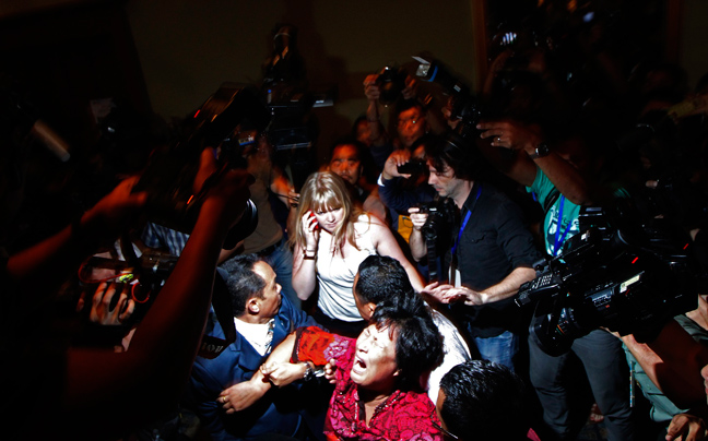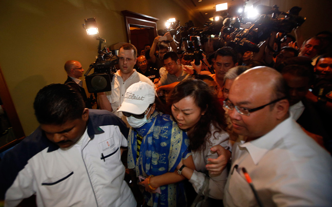 Ένταση επικράτησε στη σημερινή συνέντευξη Τύπου σχετικά με τις έρευνες για το εξαφανισμένο αεροσκάφος των Malaysia Airlines, όταν δύο συγγενείς επιβατών ξεδίπλωσαν πανό και επιχείρησαν να διαμαρτυρηθούν. Οι Αρχές της Μαλαισίας τις απομάκρυναν δια της βίας και οι δύο γυναίκες μεταφέρθηκαν σε άλλο δωμάτιο πριν τις απομακρύνουν εντελώς από το ξενοδοχείο όπου γινόταν η ενημέρωση των δημοσιογράφων. Η αγωνία για την τύχη των 239 επιβαινόντων του Boeing κλιμακώνεται όσο οι μέρες περνούν και δεν υπάρχει καμία ένδειξη για την τύχη του. Χθες συγγενείς Κινέζων επιβατών απείλησαν με απεργία πείνας διεκδικώντας ακριβέστερες πληροφορίες και περισσότερη διαφάνεια από τις Αρχές της Μαλαισίας. Δείτε τις φωτογραφίες και το βίντεο