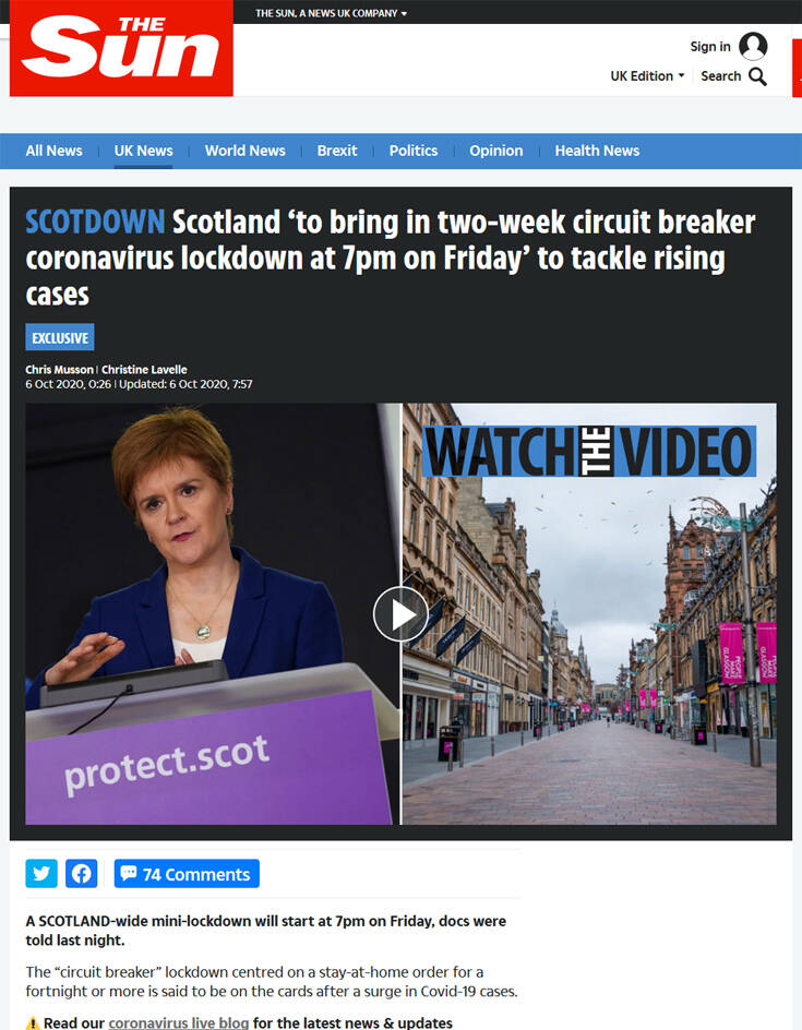 Πηγές του Εθνικού Συστήματος Υγείας (NHS) της Βρετανίας δήλωσαν στην βρετανική ταμπλόιντ ότι αναμένεται να δοθεί εντολή για παραμονή στο σπίτι στους κατοίκους όλης της Σκωτίας από τις 18:00 (21:00 ώρα Ελλάδος) της Παρασκευής.