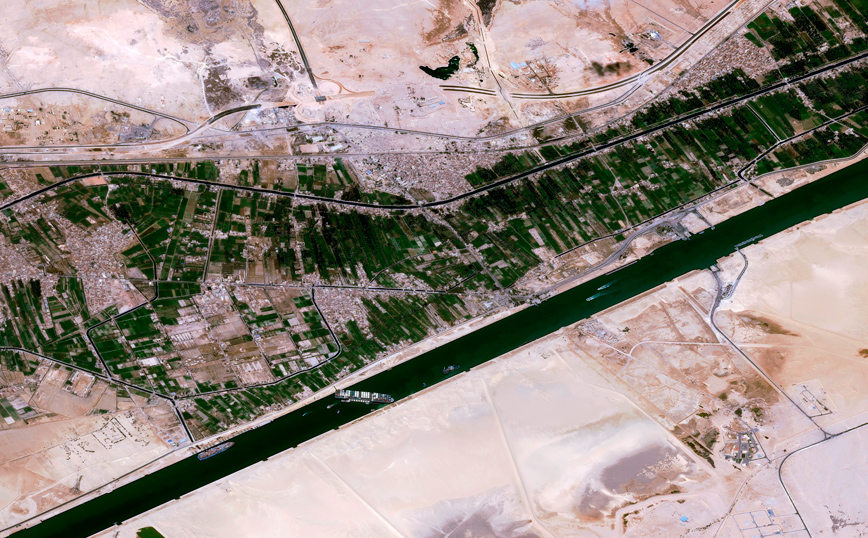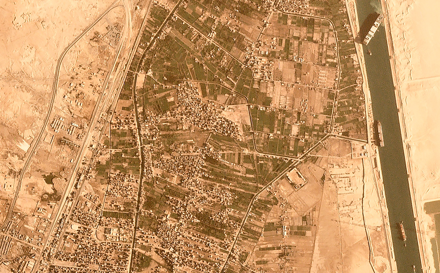Μια δορυφορική εικόνα αποκαλύπτει το μέγεθος του «μποτιλιαρίσματος» που προκλήθηκε στη διώρυγα του Σουέζ στην Αίγυπτο, όπου ένα τεράστιο πλοίο μεταφοράς εμπορευματοκιβωτίων μήκους 400 μέτρων εδώ και τέσσερις ημέρες έχει προσαράξει κλείνοντας αυτή την κρίσιμη δίοδο για την παγκόσμια εμπορική ναυσιπλοΐα.