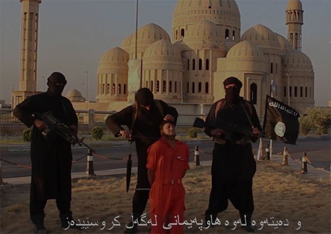 Στη συνέχεια βλέπει κανείς έναν άλλο όμηρο με πορτοκαλί στολή περικυκλωμένο από τρεις άνδρες που είναι ντυμένοι στα μαύρα μπροστά από ένα τζαμί της Μοσούλης, της επαρχιακής πρωτεύουσας της Νινευή, ενώ στο δεύτερο μισό της οθόνης περνούν εικόνες που δείχνουν συναντήσεις ανάμεσα σε κούρδους και αμερικανούς ηγέτες. Ένας από τους τζιχαντιστές αποκεφαλίζει στη συνέχεια τον κούρδο μαχητή.