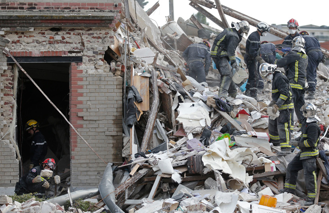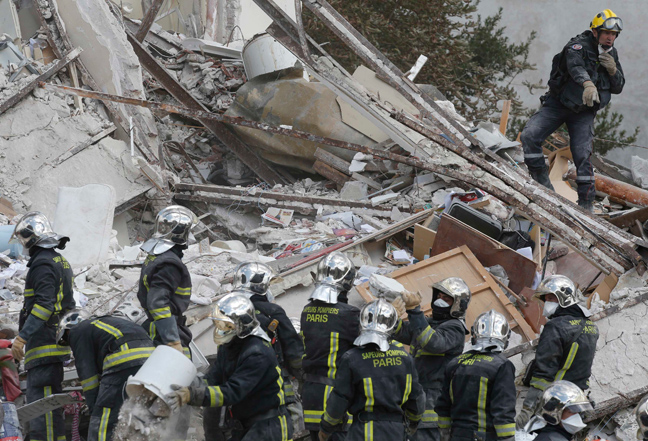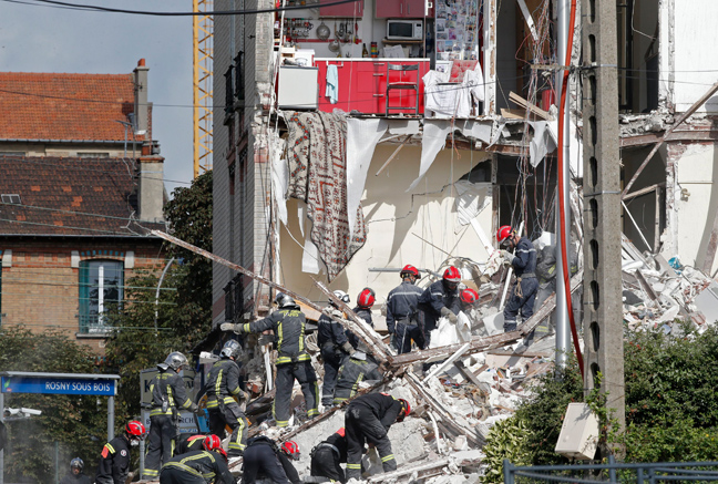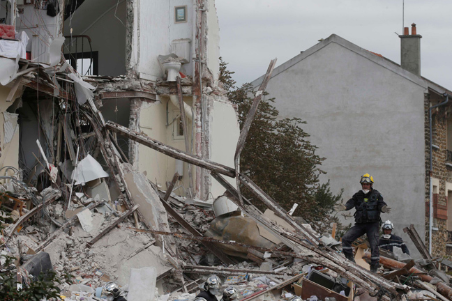 Μόνο χαλάσματα αντικρίζει κανείς στη θέση του τετραώροφου κτηρίου που κατέρρευσε χθες στο προάστιο Ροσνί-Σου-Μπουά του Παρισιού, ύστερα από έκρηξη που πιθανόν οφείλεται σε διαρροή φυσικού αερίου.