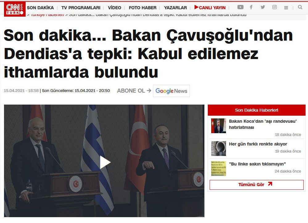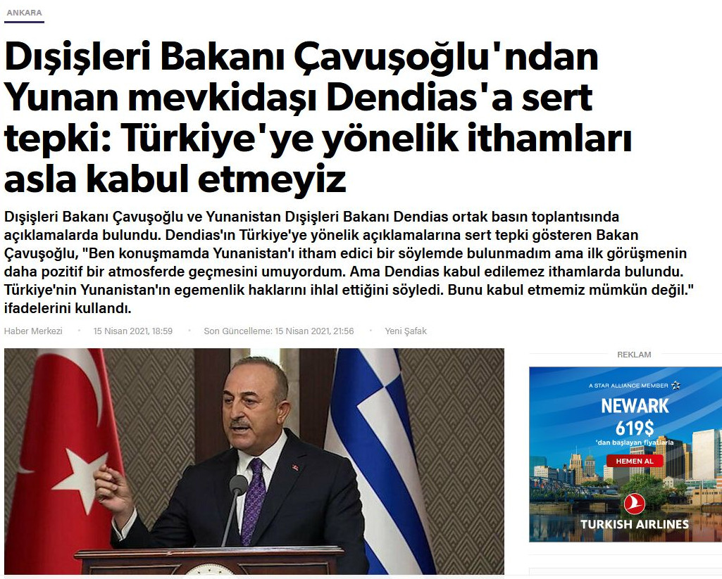 Το δημοσίευμα αναφέρει ότι «Ο υπουργός Εξωτερικών Μεβλούτ Τσαβούσογλου έκανε κοινή δήλωση με τον Έλληνα υπουργό Εξωτερικών Νίκο Δένδια. Μετά τις δηλώσεις του Δένδοια, ο υπουργός Τσαβούσογλου αντέδρασε και είπε: “Δεν κατηγόρησα την Ελλάδα στην ομιλία μου. Ο Νίκος Δένδιας δυστυχώς εξαπέλυσε εξαιρετικά απαράδεκτες κατηγορίες κατά της χώρας μου. Μίλησε για τα κυριαρχικά δικαιώματα της Ελλάδας, δεν είναι δυνατόν να το αποδεχθώ”».