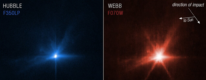 Για πρώτη φορά τα δύο μεγάλα διαστημικά τηλεσκόπια, το νεότερο James Webb και το παλαιότερο Hubble, έστρεψαν τις κάμερες τους ταυτόχρονα και φωτογράφισαν τον ίδιο ουράνιο στόχο: την επιτυχή αυτοκαταστροφική πρόσκρουση της αμερικανικής διαστημοσυσκευής DART πάνω στον μικρό αστεροειδή Δίμορφο, το βράδυ της περασμένης Δευτέρας. Αυτό αποτέλεσε το πρώτο τεστ πλανητικής άμυνας για την μελλοντική περίπτωση που ένας μεγαλύτερος διαστημικός βράχος θα απειλήσει τη Γη και θα πρέπει να εκτραπεί της πορείας του.