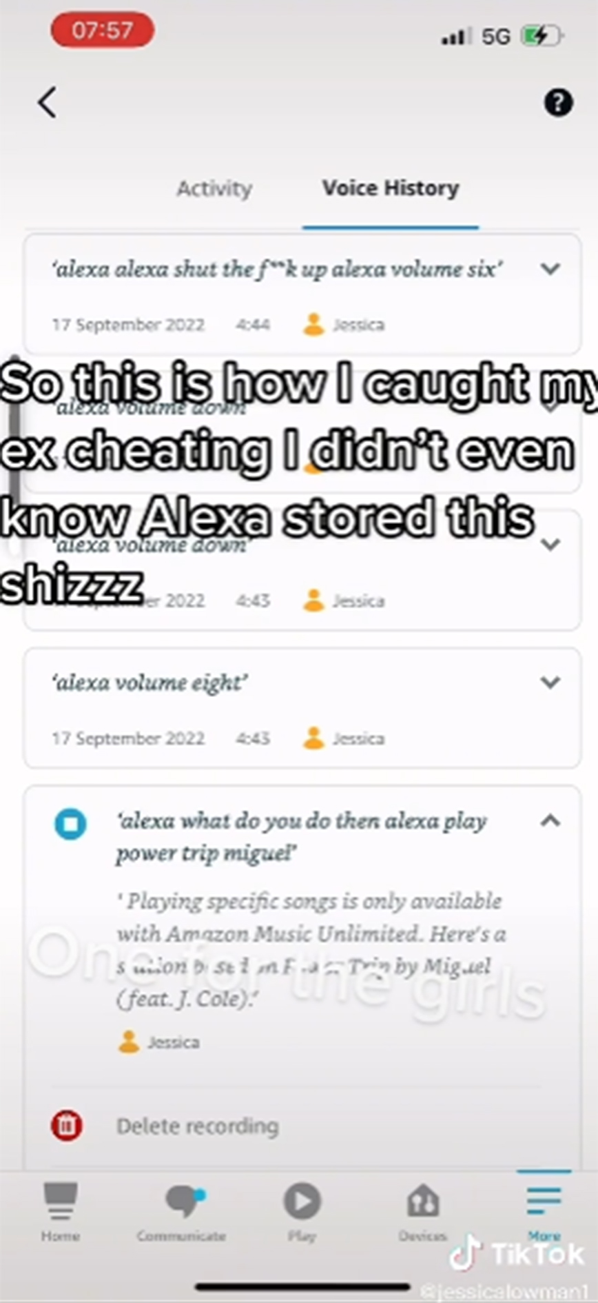 Όπως αναφέρει η mirror.co.uk, η Jessica Lowman ανέβασε βίντεο στο TikTok, όπου εξιστορεί όσα βίωσε και αναφέρει ότι ανακάλυψε τυχαία την δυνατότητα ηχογράφησης από το Alexa.