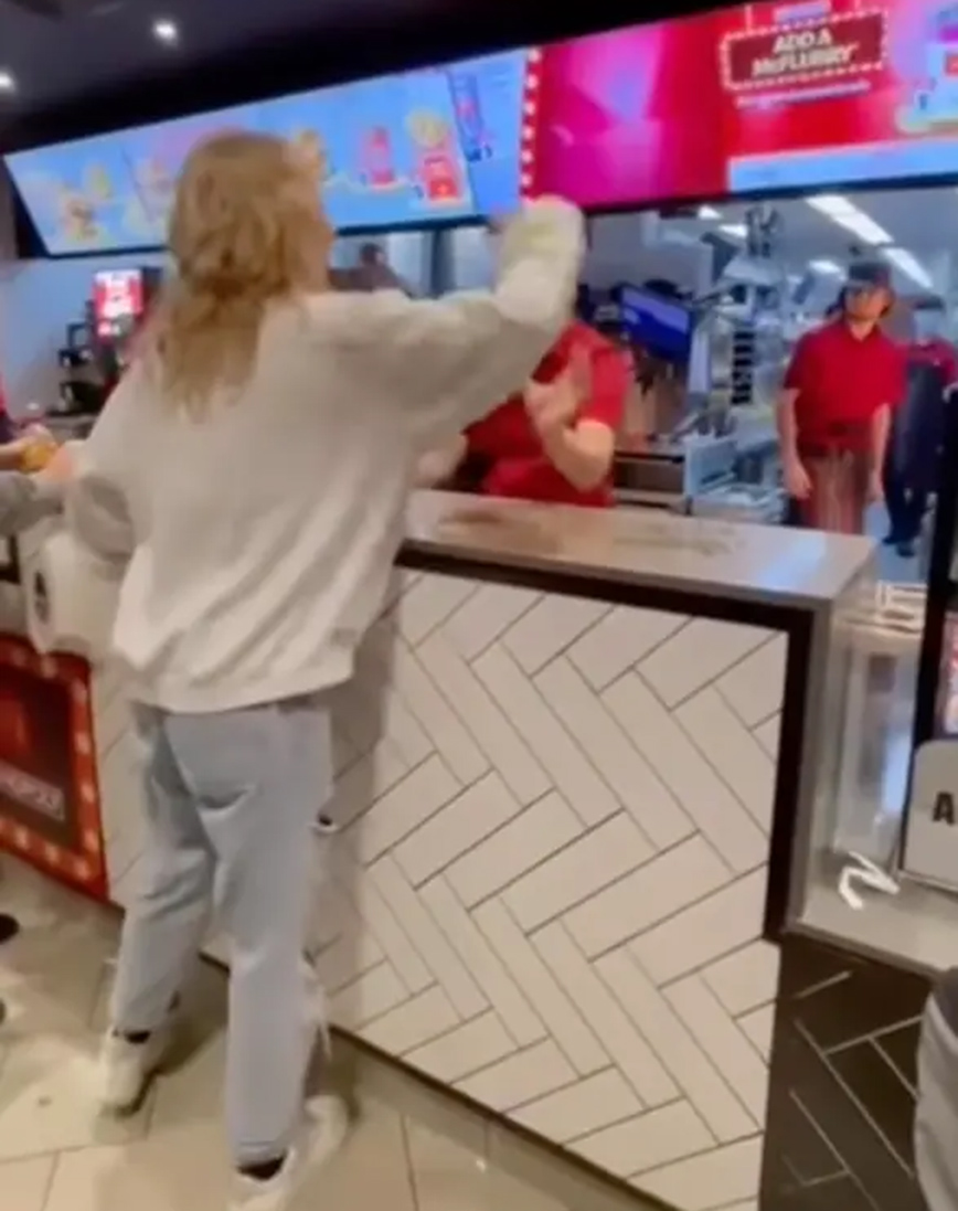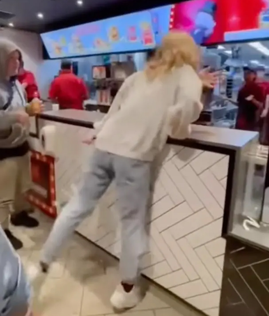 Τότε αρχίζει να πετά φαγητά και πακέτα που πιάνει από τον πάγκο στο προσωπικό. Κάποιοι εργαζόμενοι προσπαθούν να την ηρεμήσουν, την ώρα που ουρλιάζει και πετά αντικείμενα.