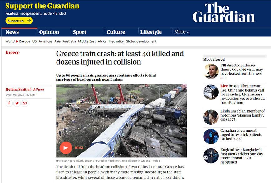 «Σιδηροδρομικό δυστύχημα στην Ελλάδα: Τουλάχιστον 40 νεκροί και δεκάδες τραυματίες σε σύγκρουση», γράφει ο Guardian και συμπληρώνει στον τίτλο του: «Έως και 60 άνθρωποι αγνοούνται καθώς οι διασώστες συνεχίζουν τις προσπάθειες για τον εντοπισμό επιζώντων από τη μετωπική συντριβή κοντά στη Λάρισα».