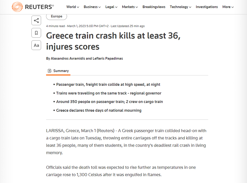 Τις βασικότερες πληροφορίες για το σιδηροδρομικό δυστύχημα, αλλά και μαρτυρίες μεταδίδει το Reuters κάνοντας λόγο για «δάκρυα και οργή». Εικόνα από το πολύνεκρο δυστύχημα στην Ελλάδα έχει ως κεντρικό θέμα στη σελίδα του το Γαλλικό Πρακτορείο Ειδήσεων.