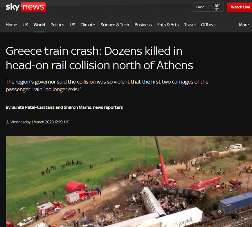 «Σιδηροδρομικό δυστύχημα στην Ελλάδα: Δεκάδες οι νεκροί σε μετωπική σύγκρουση αμαξοστοιχιών», γράφει στον τίτλο το SkyNews, αναφέροντας και τις δηλώσεις του περιφερειάρχη πως «τα δύο πρώτα βαγόνια του επιβατικού τρένου δεν υπάρχουν πλέον».