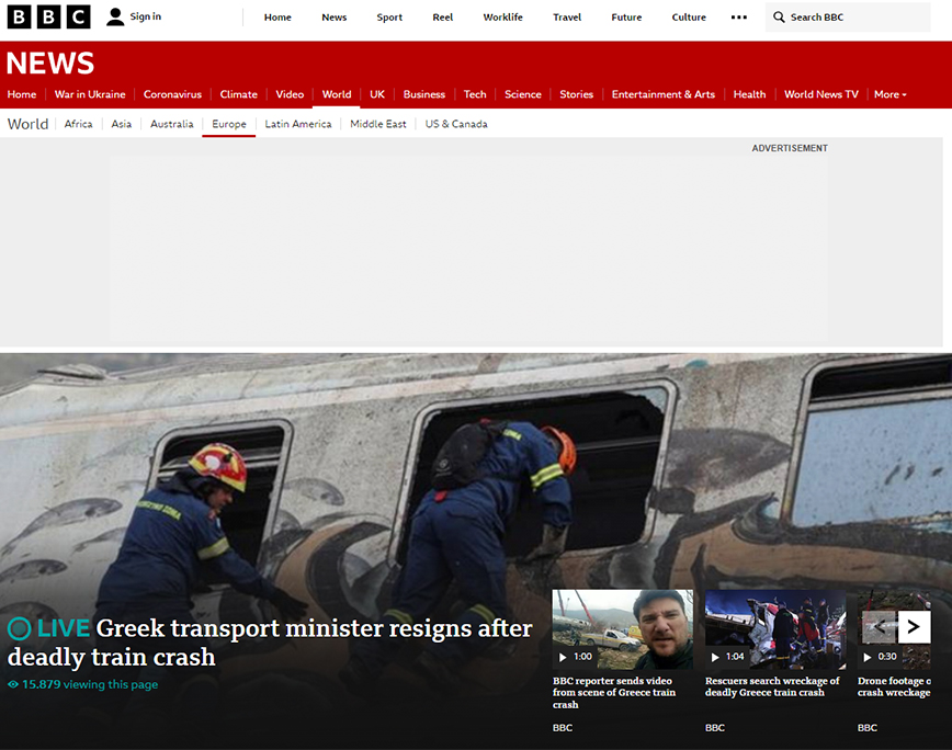 Το BBC παρουσιάζει το θέμα live blog, καταγράφοντας τις εξελίξεις λεπτό προς λεπτό. «Παραιτήθηκε ο υπουργός Μεταφορών μετά τη φονική σύγκρουση τρένων», αναφέρει στον τίτλο, ενώ δημοσιεύει και πολλά βίντεο από το σημείο της τραγωδίας.