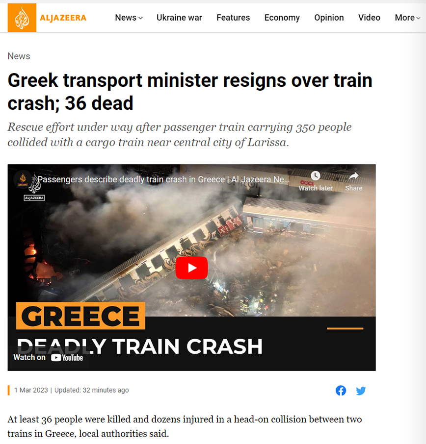 «Παραιτήθηκε ο Έλληνας υπουργός Μεταφορών για το σιδηροδρομικό δυστύχημα. 36 νεκροί. Σε εξέλιξη επιχείρηση διάσωσης μετά τη σύγκρουση επιβατικής αμαξοστοιχίας, που μετέφερε 350 άτομα, με εμπορικό τρένο κοντά στη Λάρισα», γράφει το Aljazeera.