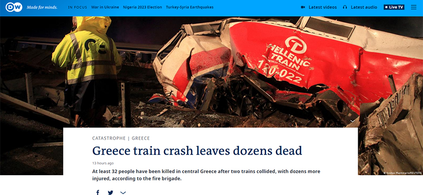 Συνοψίζοντας τα γεγονότα γράφει: «Συνελήφθη ο σταθμάρχης, τουλάχιστον 36 άνθρωποι έχασαν τη ζωή, στον τόπο της συντριβής ο Έλληνας πρωθυπουργός δεσμεύτηκε να διαλευκανθεί η αιτία της καταστροφής. Οι διασώστε συνεχίζουν τις έρευνες για επιζώντες, ενώ κηρύχτηκε τριήμερο εθνικό πένθος».