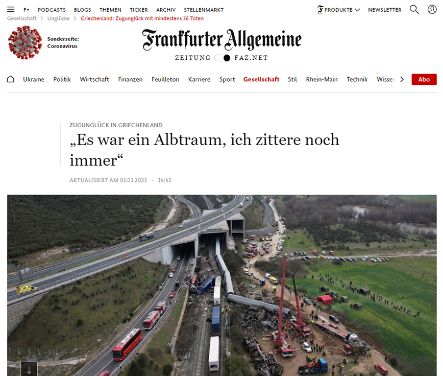 «Δεκάδες νεκροί από σιδηροδρομικό δυστύχημα στην Ελλάδα», γράφει η Deutsche Welle, ενώ η FAZ έχει για τίτλο μια μαρτυρία: «Ήταν ένας εφιάλτης, ακόμα τρέμω». Και σημειώνει: «Μια τεράστια άμορφη μάζα: Η εικόνα από τον τόπο του δυστυχήματος στην Ελλάδα. Τουλάχιστον 36 οι νεκροί και δεκάδες οι τραυματίες στην Ελλάδα, όπου επικρατεί θλίψη, φρίκη και οργή».